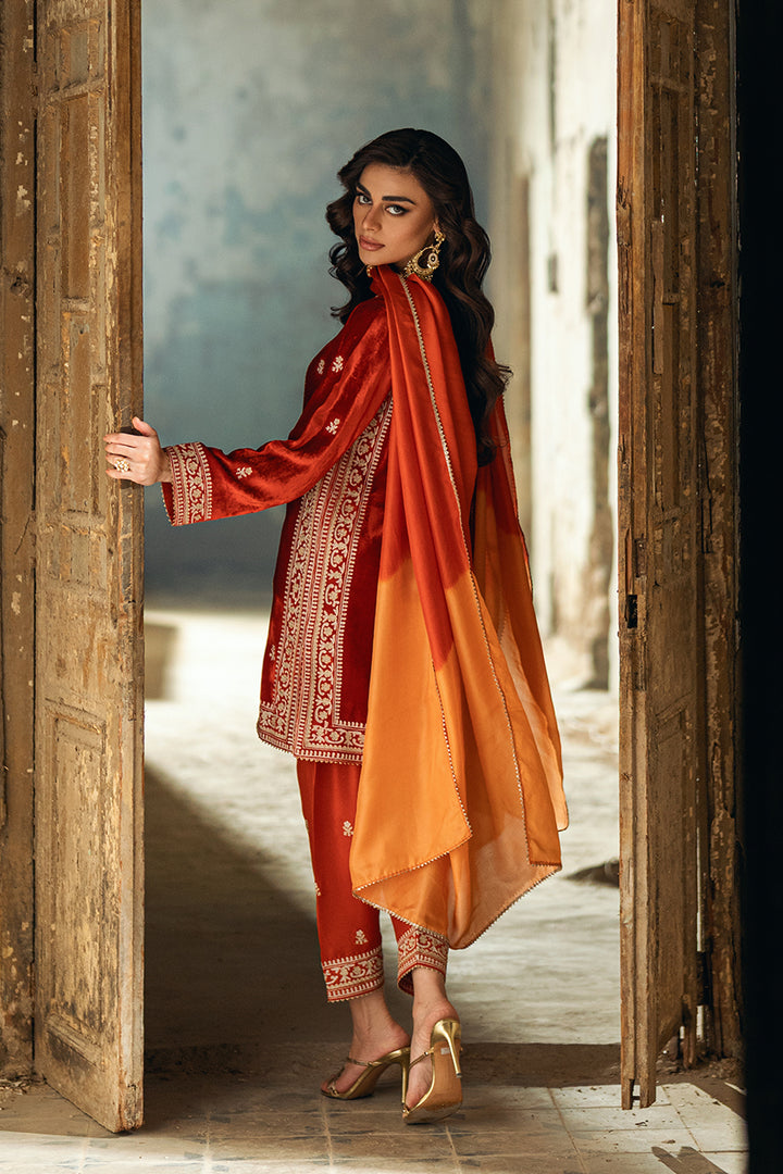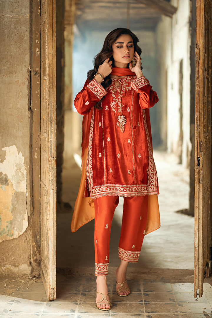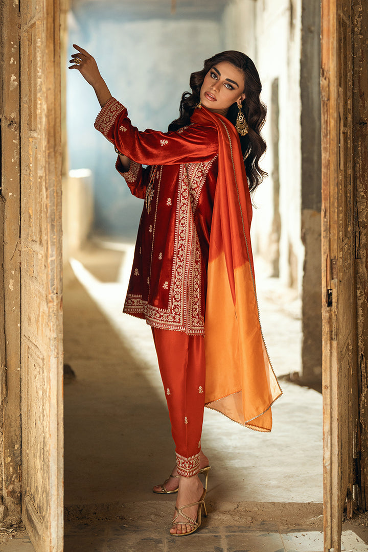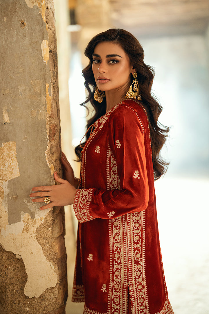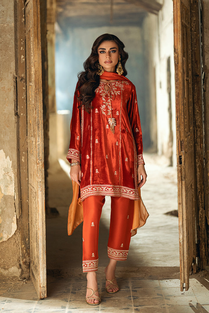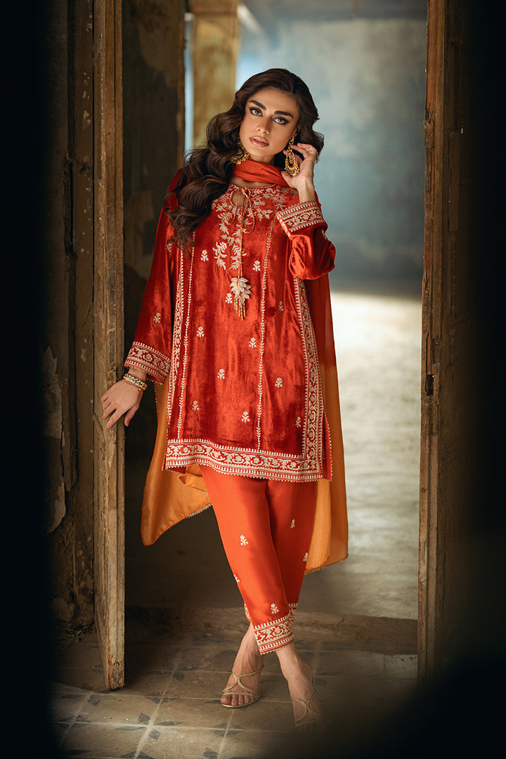 A short kurta-style velvet shirt featuring golden and silver zari ari work, highlighted with playful tassel embellishments. Paired with an embroidered shalwar and a two-toned medium silk dupatta for a vibrant, chic finish.