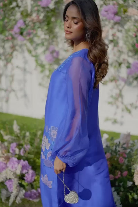 A statement raw silk kaftan, exquisitely embroidered with refined applique work and enhanced with hand embellishment on the neckline at both front and back. The look is completed with flowing organza balloon sleeves, lending a contemporary yet regal silhouette.