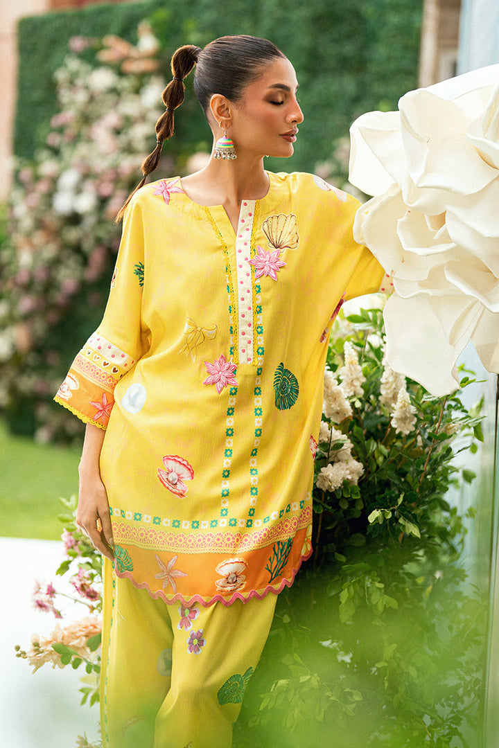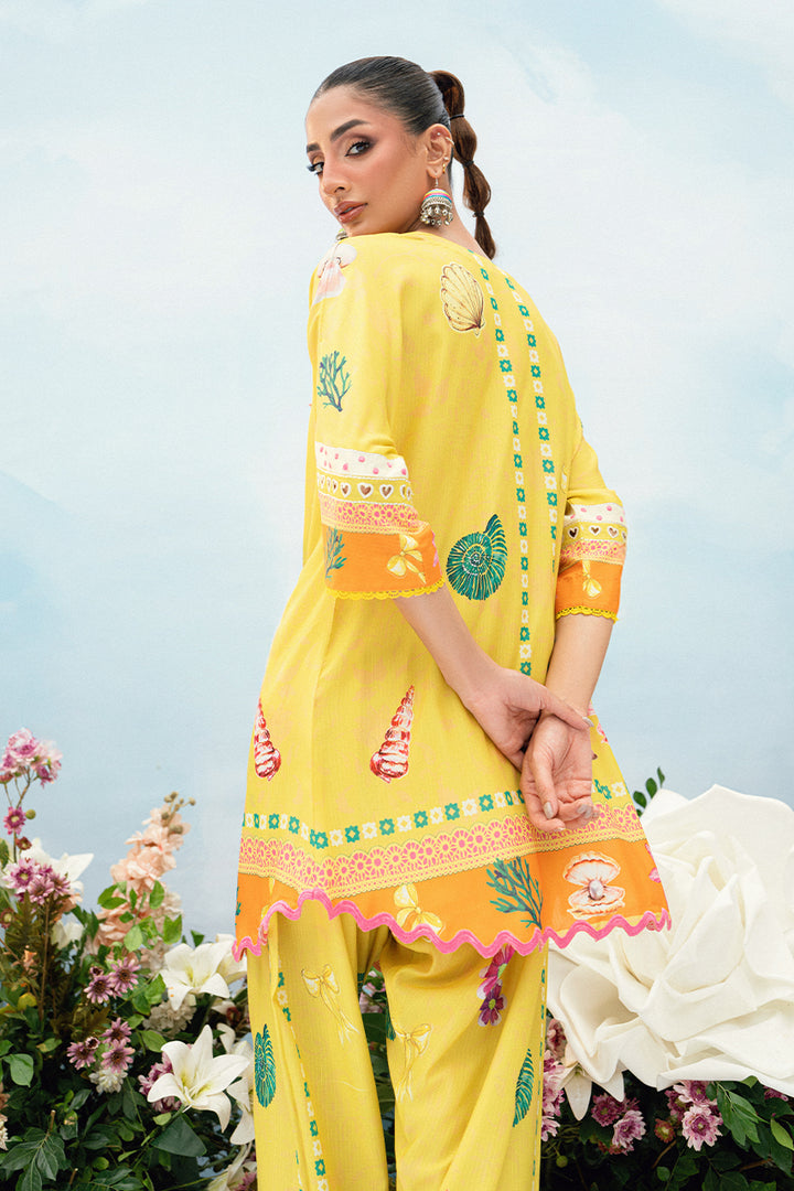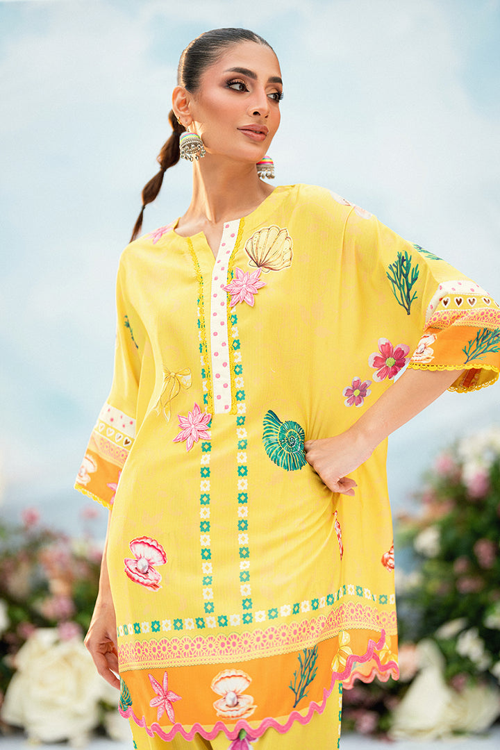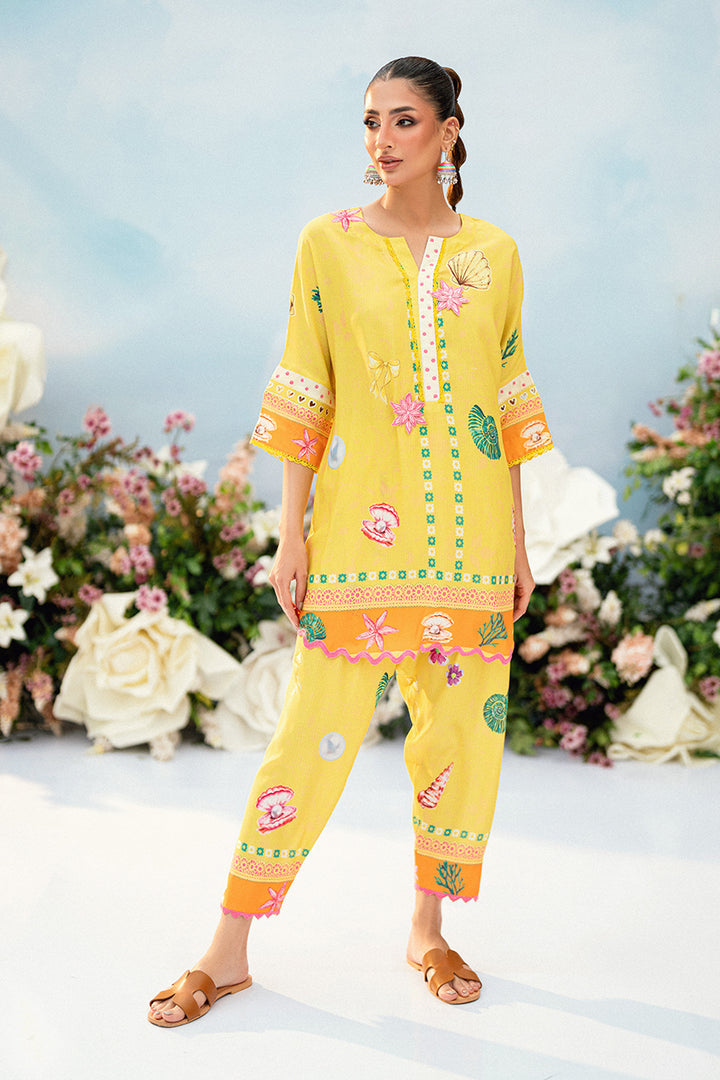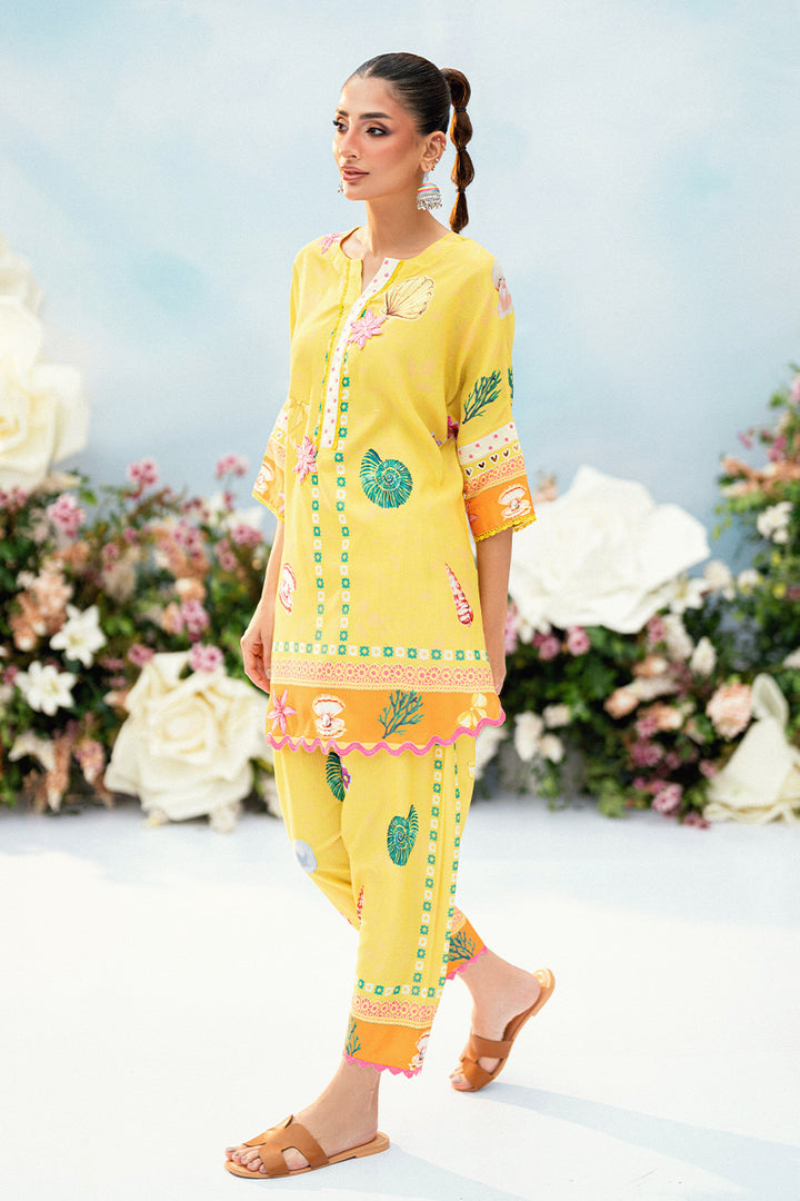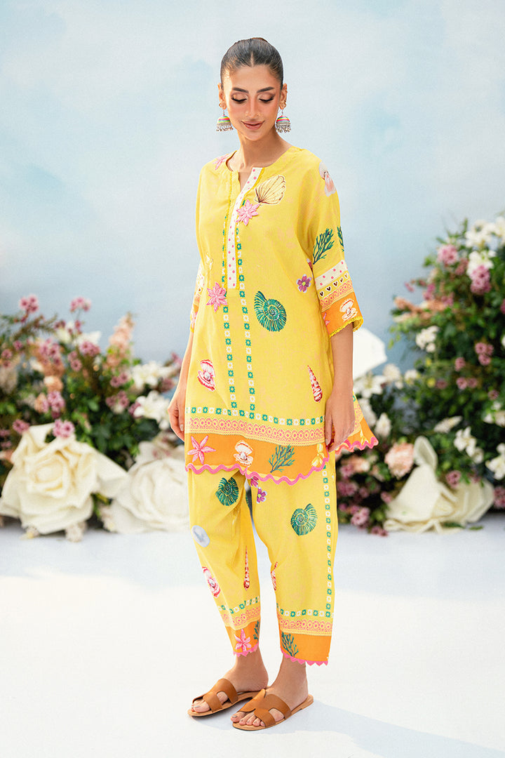 A cheerful digital cotton outfit featuring a beautiful seashell print. Styled with a straight shalwar, it reflects freshness and effortless style.