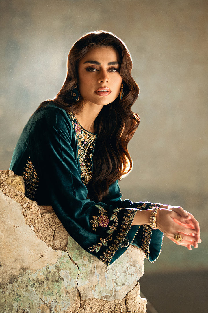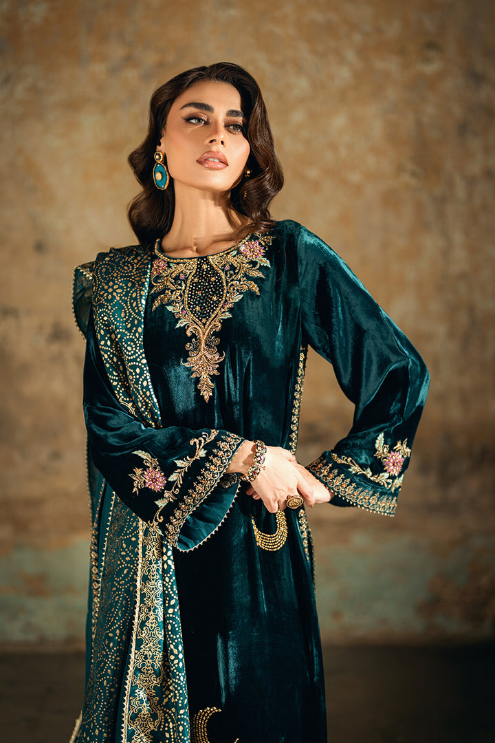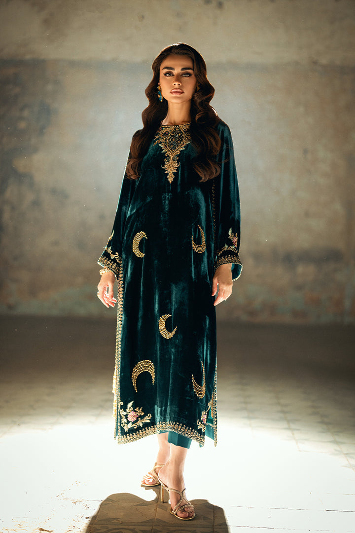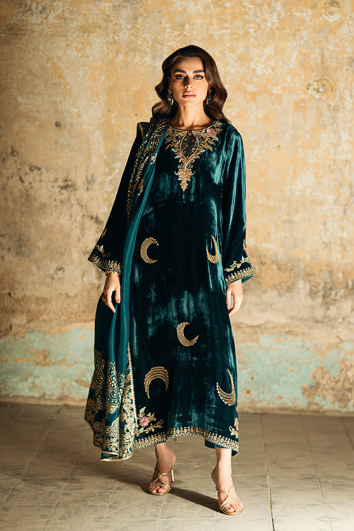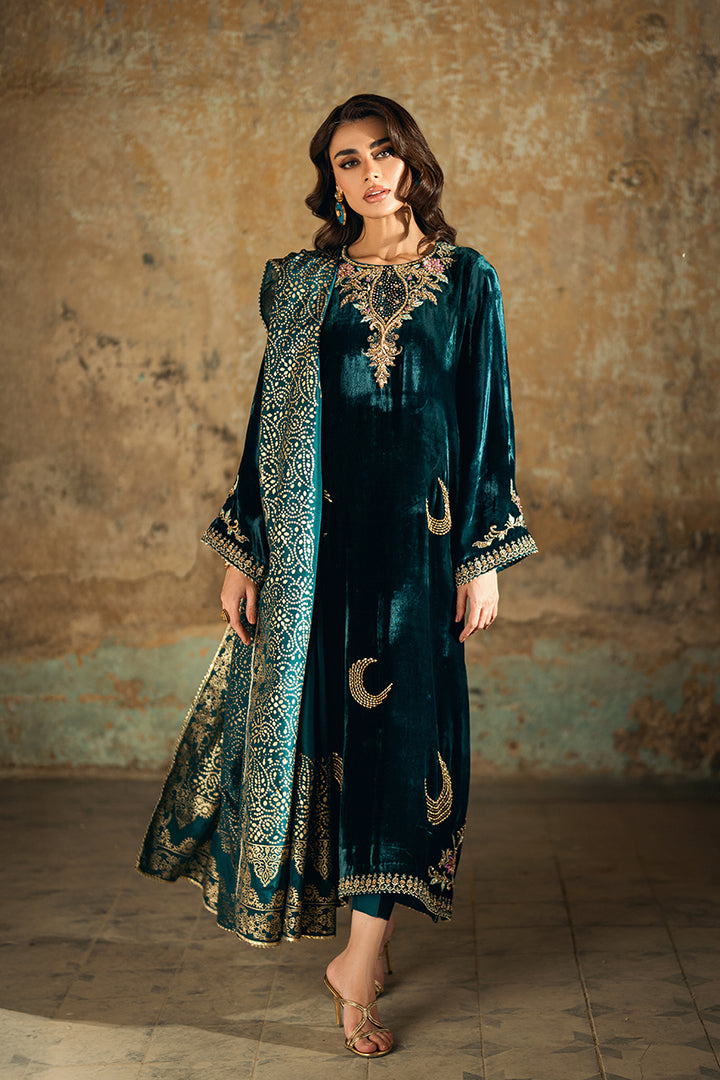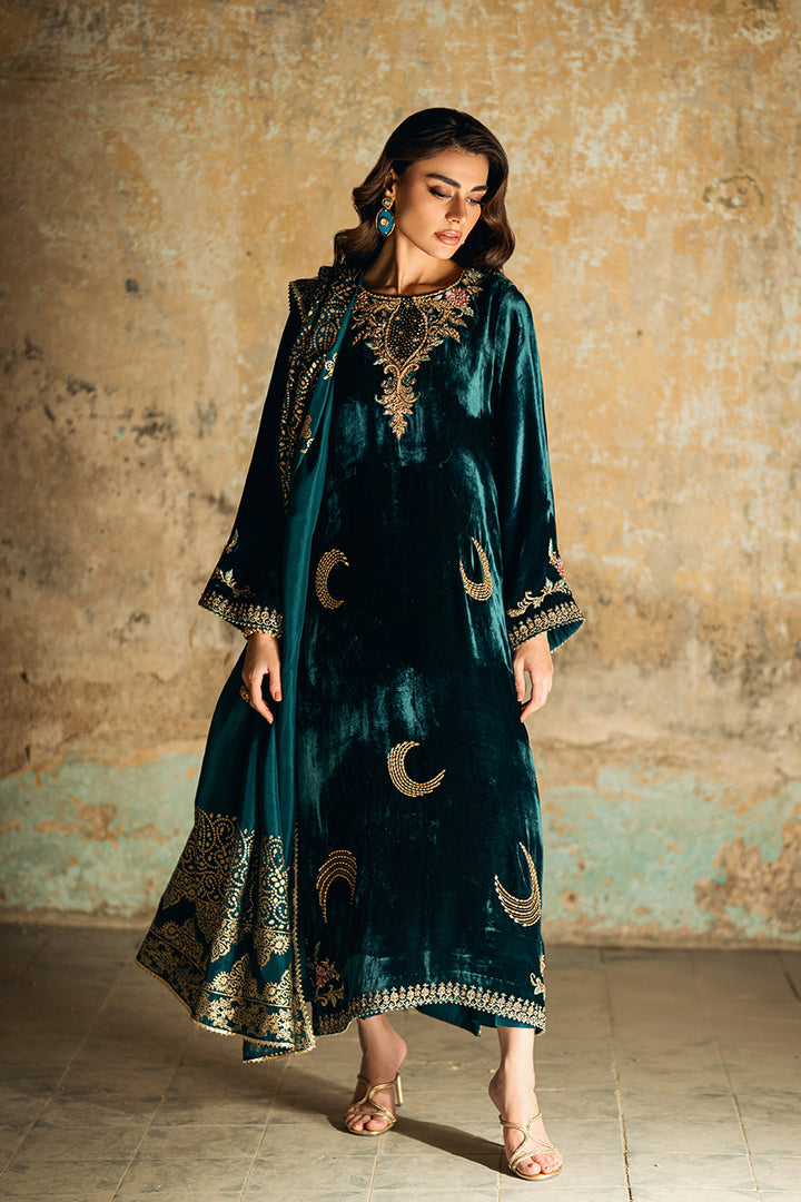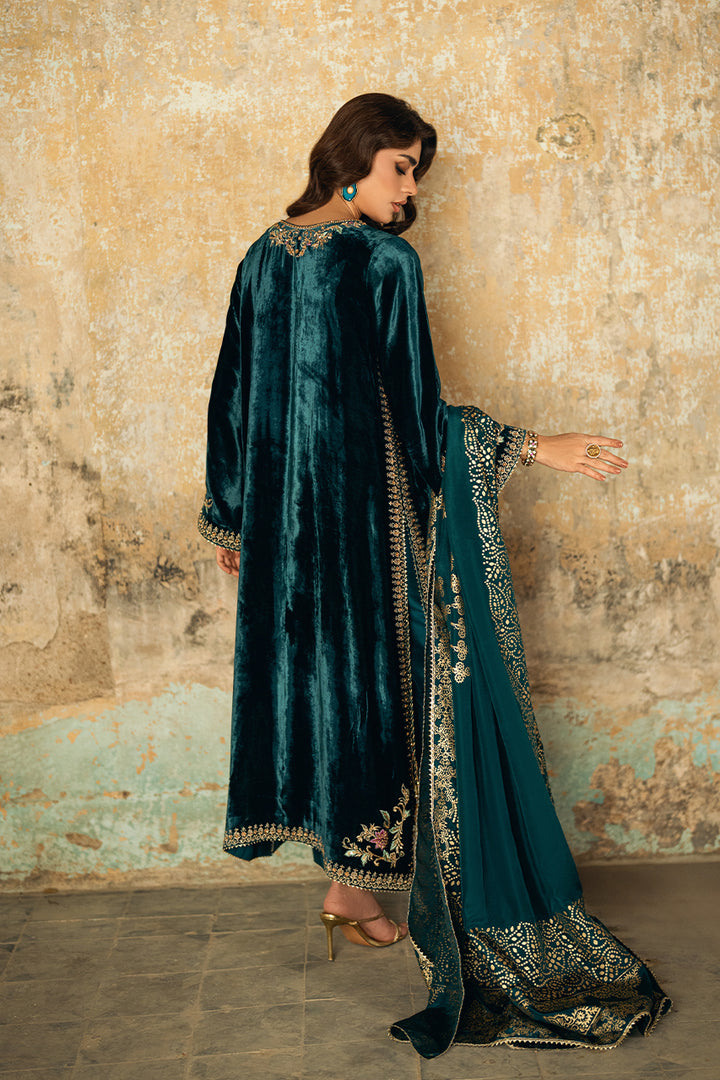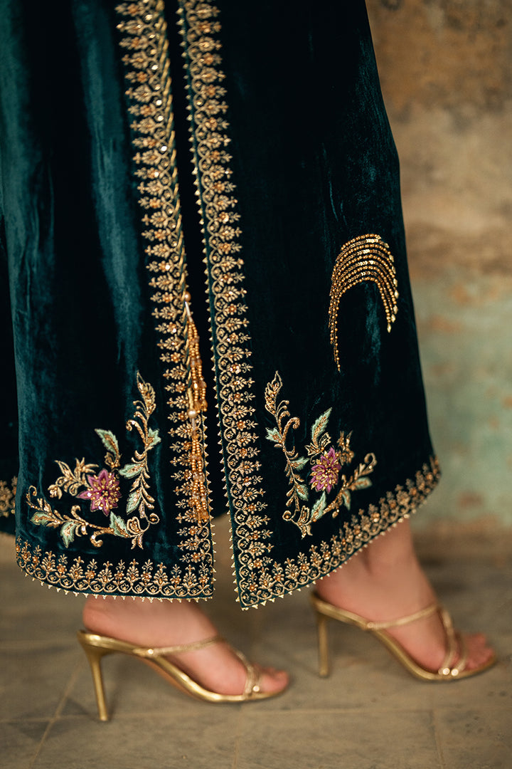 A rich velvet shirt featuring machine embroidery and refined embellishments of sequins and pearls on both front and back. Styled with raw silk trousers and a medium silk block print dupatta. Tassels on the slits add a hint of graceful movement to the ensemble.