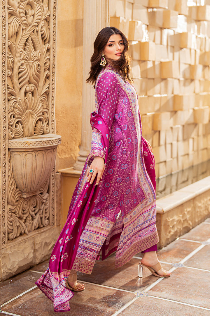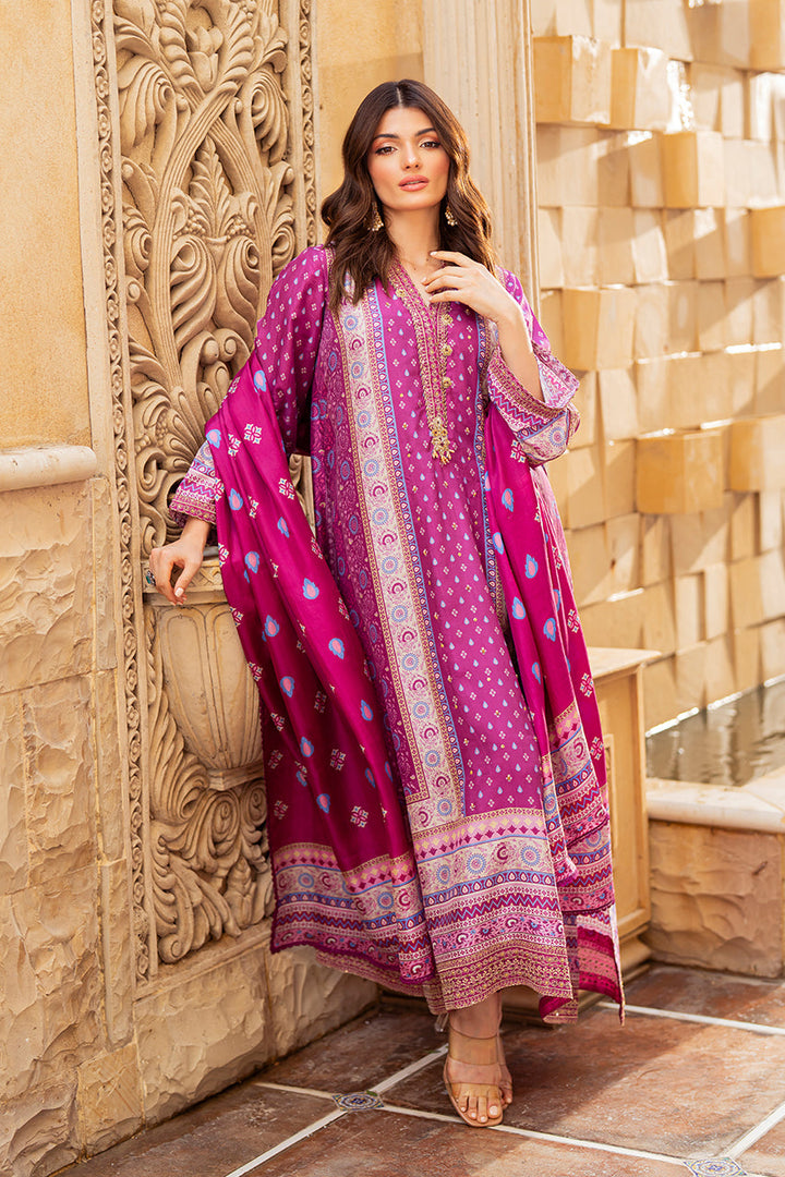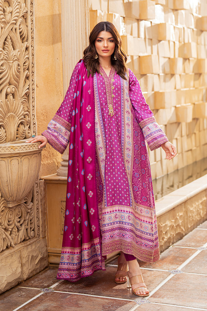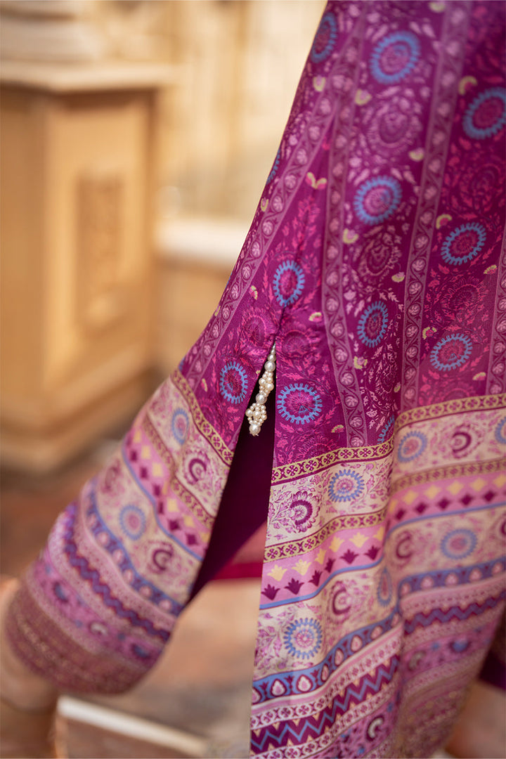 Crafted from digital raw silk, this shirt is embellished with elegant embroidery, pearls, light sequins, and subtle detailing. Comes with pants and a coordinating digital raw silk dupatta for a refined festive look.