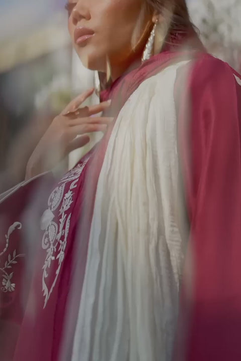 A refined raw silk short shirt, beautifully enhanced with delicate embroidery and finished with elegant dori piping for a clean, structured look. Paired with a raw silk straight shalwar featuring subtle embroidered detailing. The ensemble is completed with a softly crushed, two-tone medium silk dupatta, gracefully finished with lace edging on all four sides for a timeless finish.